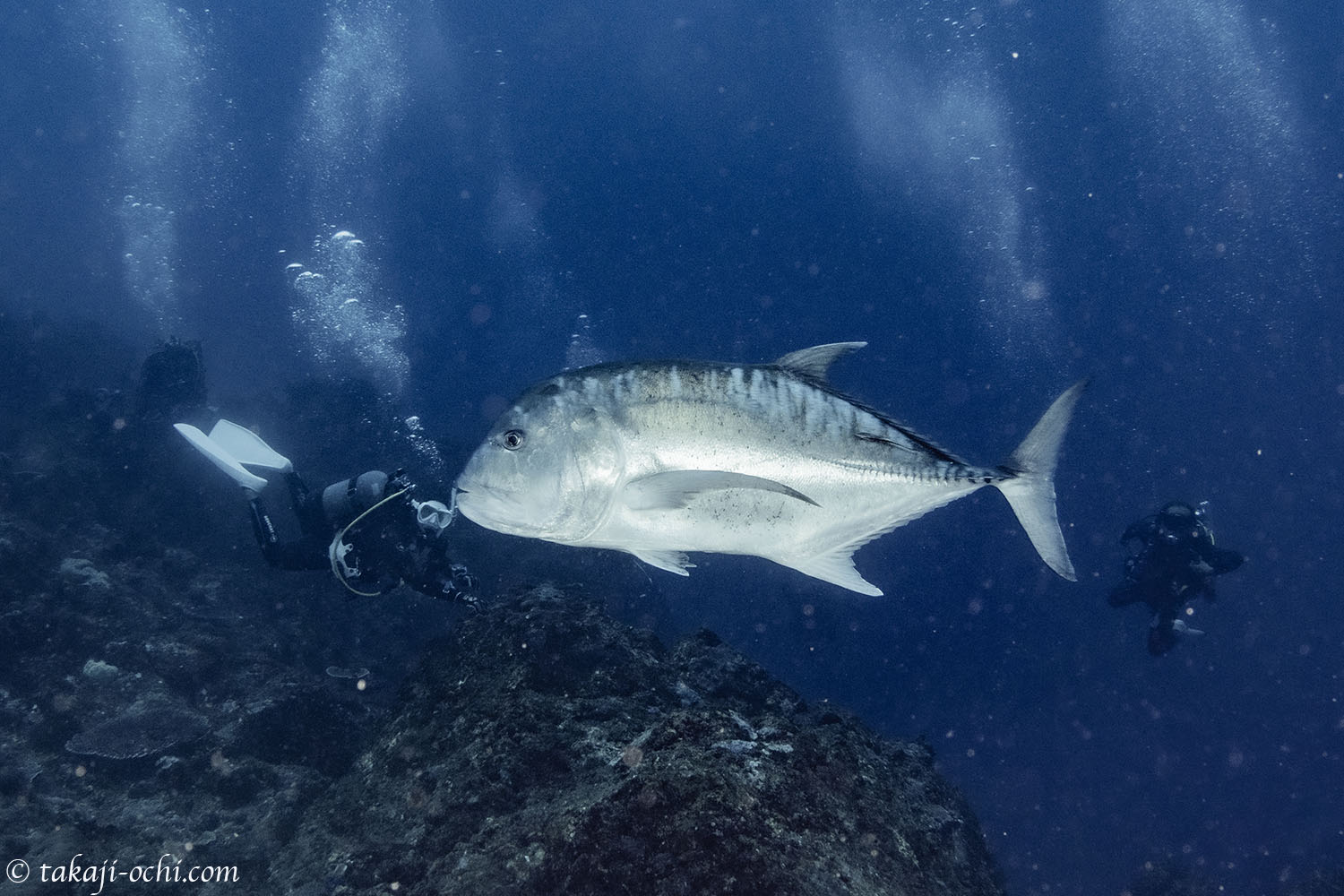 群れはいなかったものの、ドラム缶のように丸々としたカマストガリザメや同じく巨大なハンマーが数匹、それにロウニンアジなどに遭遇。