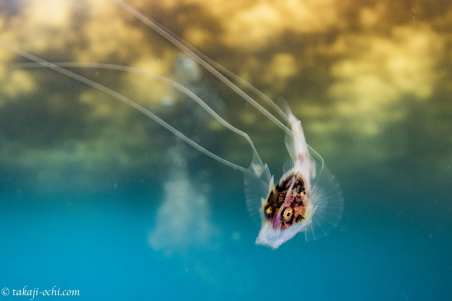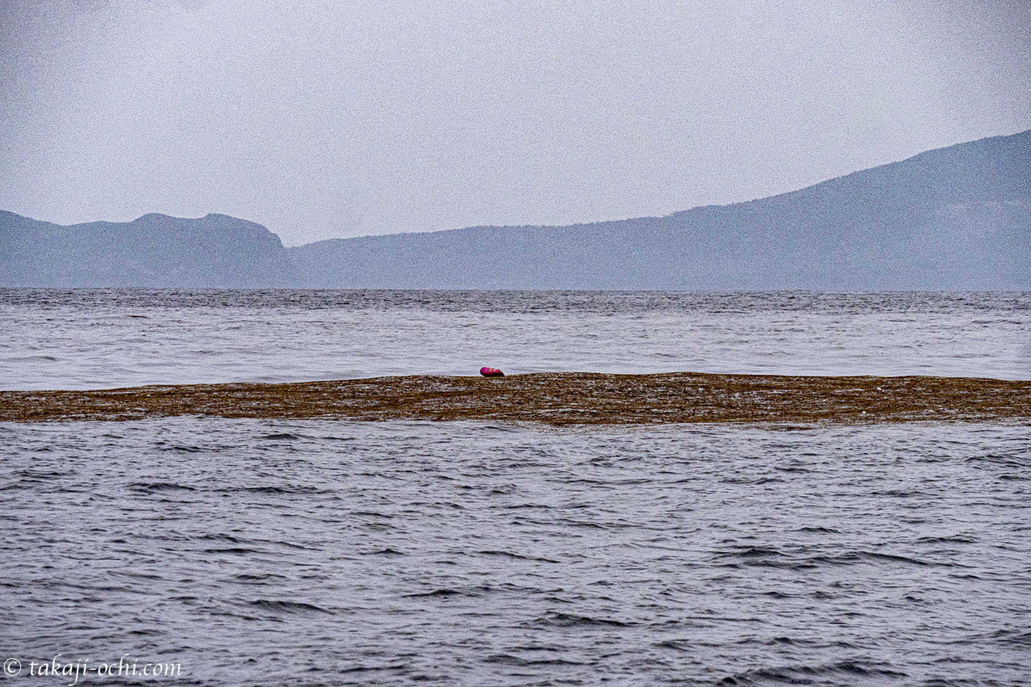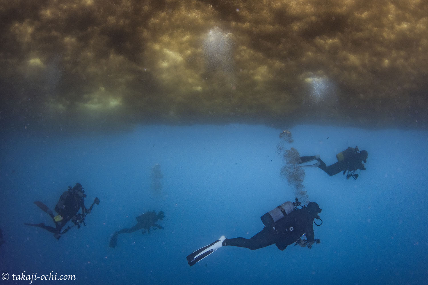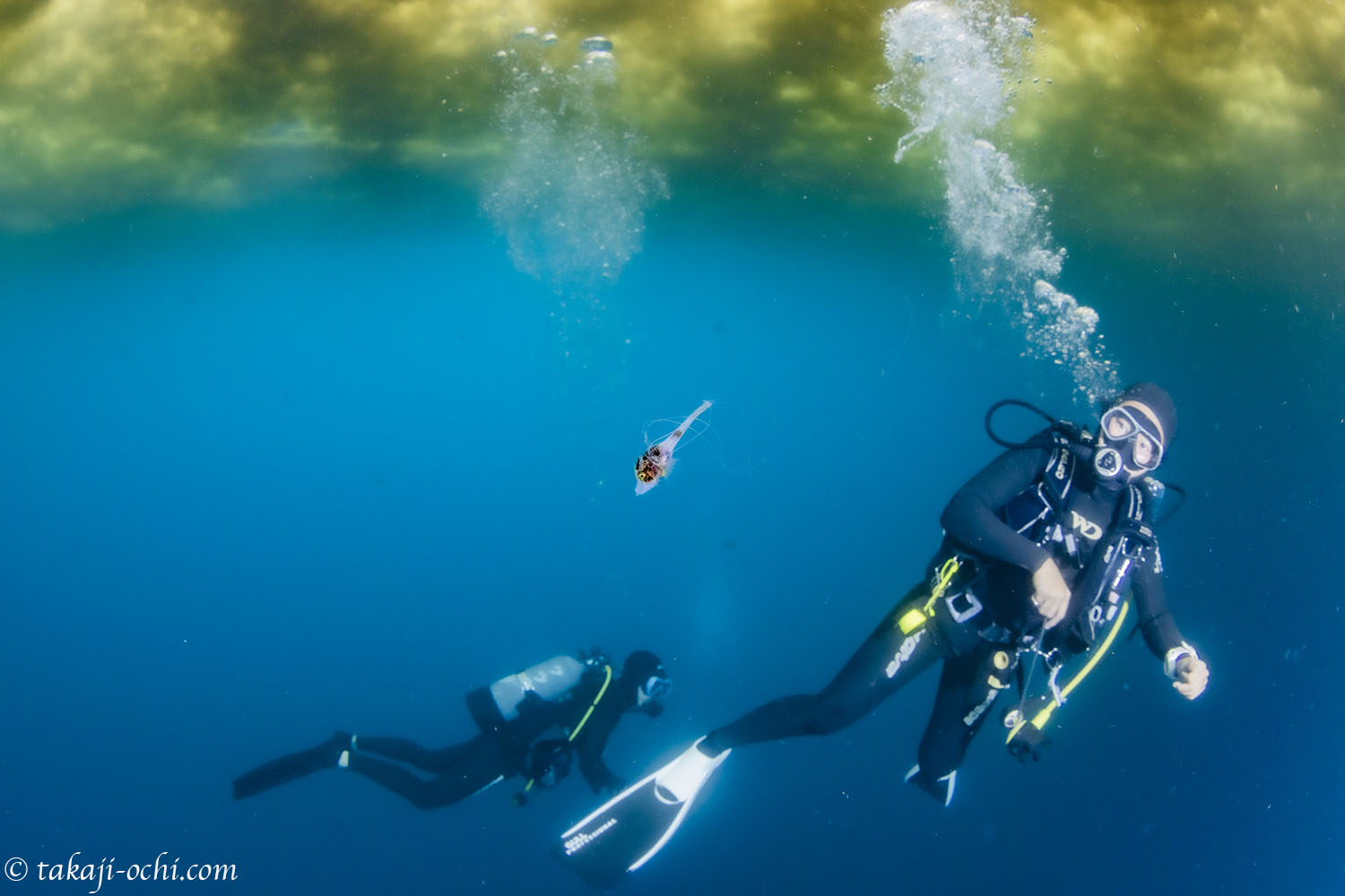 最終ダイブはこのリサーチの本来の目的でもあった、外洋に溜まった巨大流れ藻の下を潜るダイビング。さて、バショウカジキはいるのか!?と多少は期待して潜ったが、下にいたのはやはり浮遊系ばかり、、、ワイドレンズで浮遊系を流れ藻を絡めて撮影して、枕崎へと帰港した。